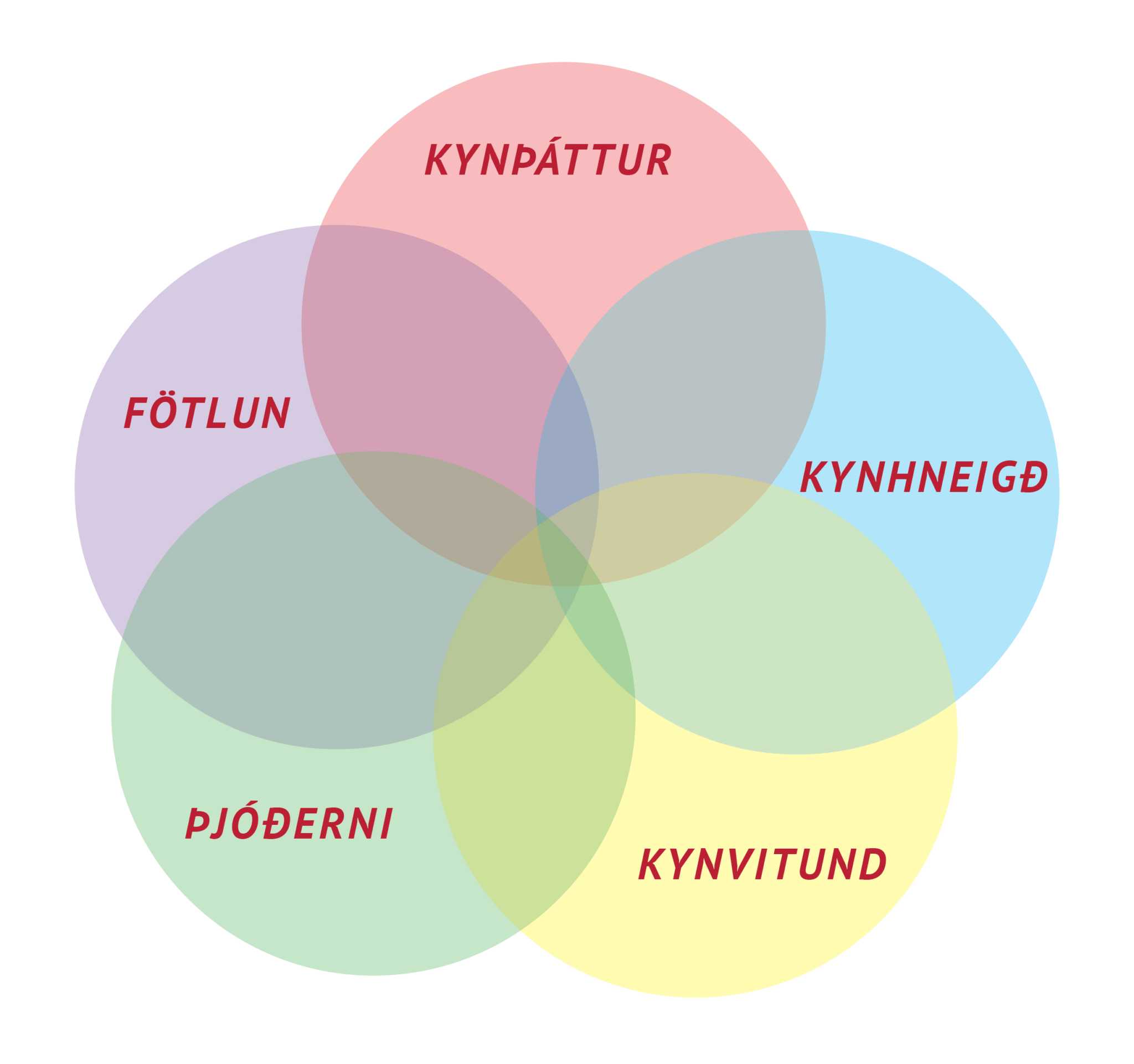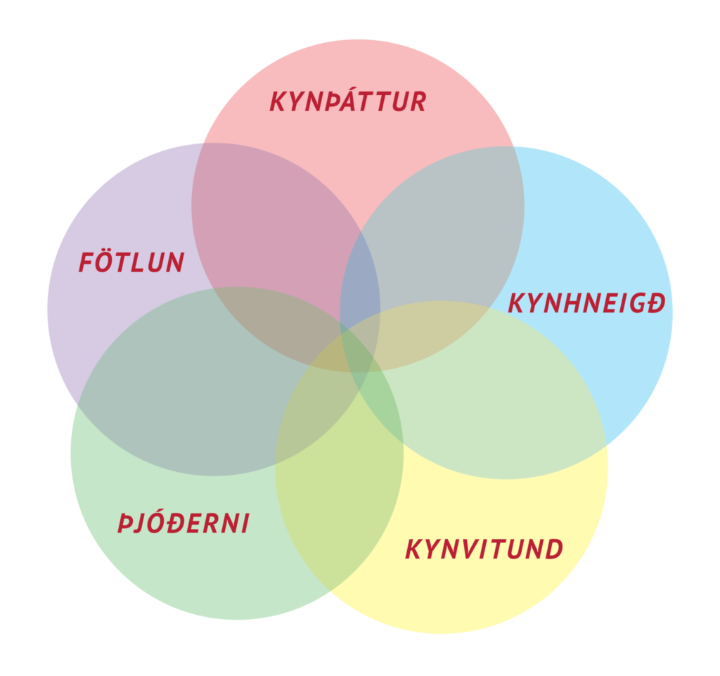 Ég hef verið að hugsa um hugtakið intersectionality. Það merkir að hægt sé að verða fyrir lagskiptu ójafnrétti byggðu á mörgum breytum, til dæmis kyni, þjóðerni, fötlun, kynhneigð o.s.frv. o.s.frv. Ef þú google-ar orðið þá færðu upp myndir sem líta nokkurn veginn svona út. Stundum fleiri breytur, stundum færri. En alla jafna finnst mér að einni ákveðinni breytu er sleppt – tegundum. Eiginlega hef ég verið að hugsa um þetta síðan ég skrifaði ritgerð í kúrsi um mannréttindaheimspeki við háskóla í Austur-Evrópu. Þar langaði mig að byggja upp röksemdafærslu fyrir því að önnur dýr ættu að fá að njóta ákveðinna réttinda, til dæmis yfir eigin líkama, því mér fannst að grunnréttindi ættu ekki að einskorðast við mannfólk. Löng saga mjög stutt þá fékk ég ömurlega gagnrýni til baka frá kennaranum. Hún var bæði móðguð og pirruð yfir því að ég skyldi dirfast að líkja saman líkama dýra og kvenna í tilraun til að skoða hvort frelsisbarátta þessara hópa gæti mögulega heyrt undir sama hatt. (Jebb, we’re going there.) Henni fannst þetta tvennt fullkomlega ósamrýmanlegt og að með þessu væri ég í raun að smætta konuna niður í hugmyndir feðraveldisins um að hún væri ‘bara’ framleiðsluvél fyrir afkvæmi karla. Að ég væri að móðga konur með því að líkja þeim við dýr … og það vakti mig enn frekar til umhugsunar.